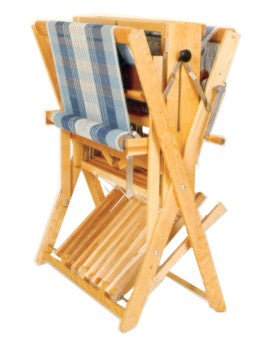 This jack-type floor loom is light but solid and easily moveable when folded. It is designed for workshops and demonstrations. To fold, slightly unscrew the two handles on the sides of the loom and slide them up. It can be folded easily even after weaving has started.